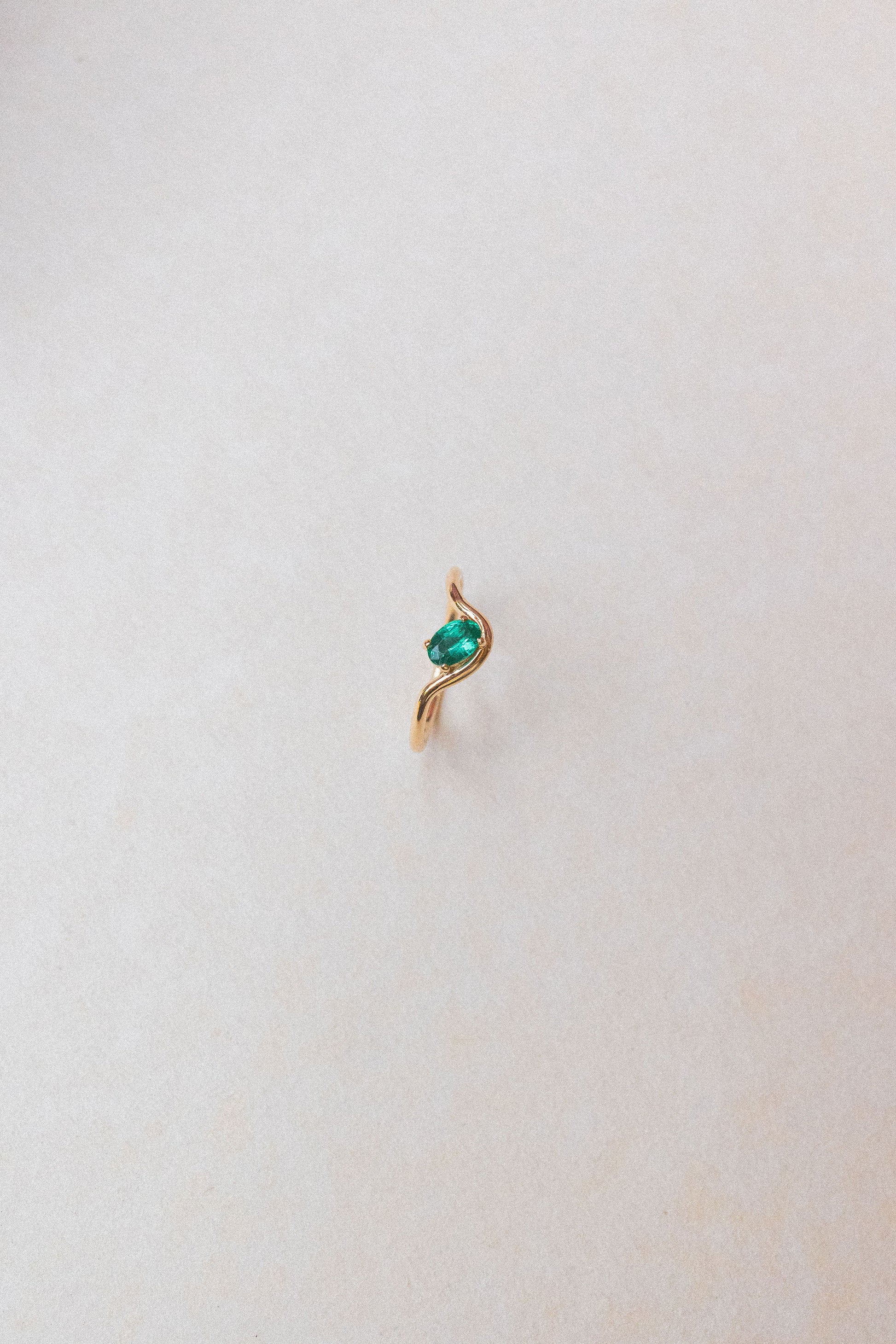 Diseñado con una esmeralda ovalada y oro amarillo de 14k en formas curvas y ondulantes, un diseño que evoca al movimiento constante del mar.