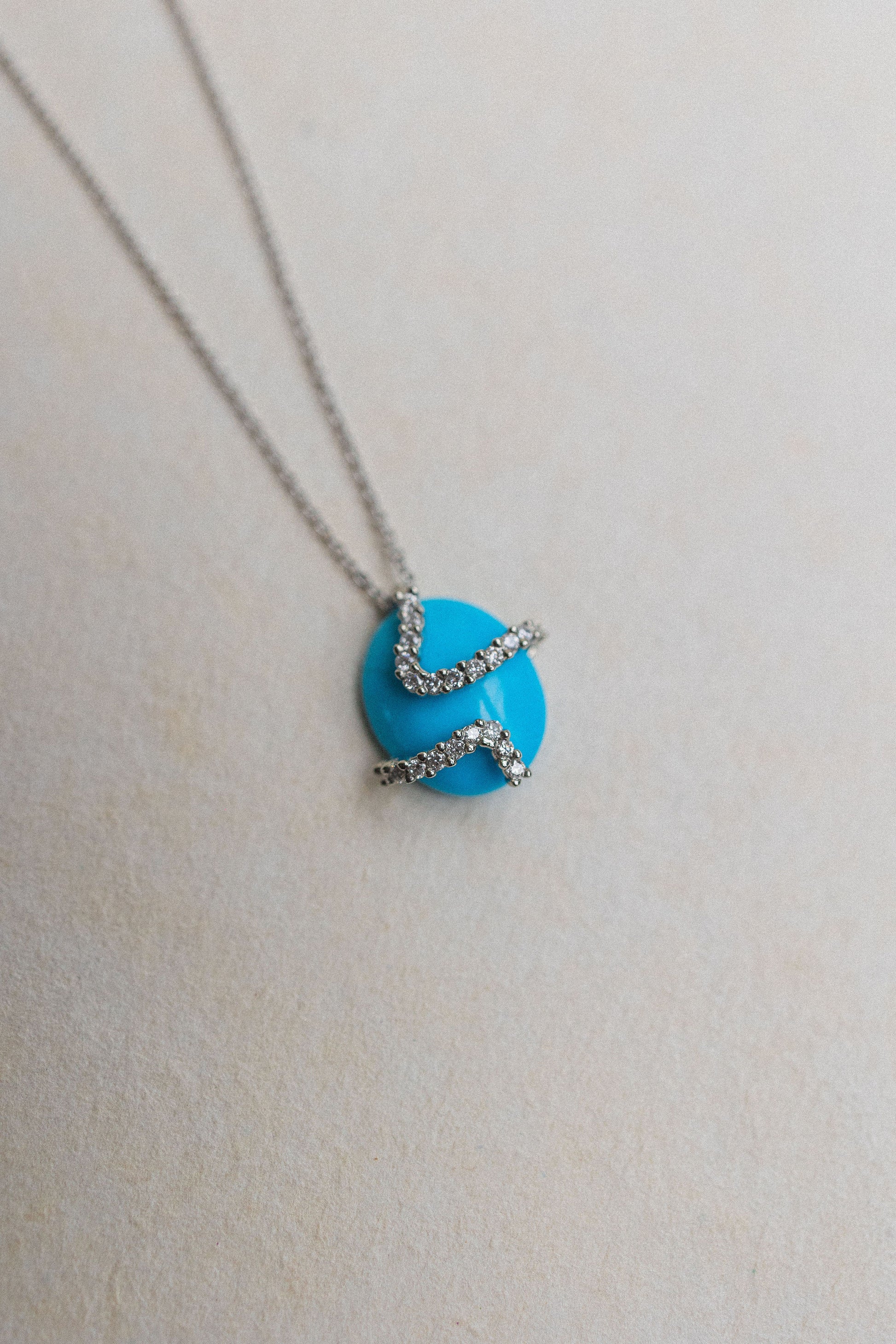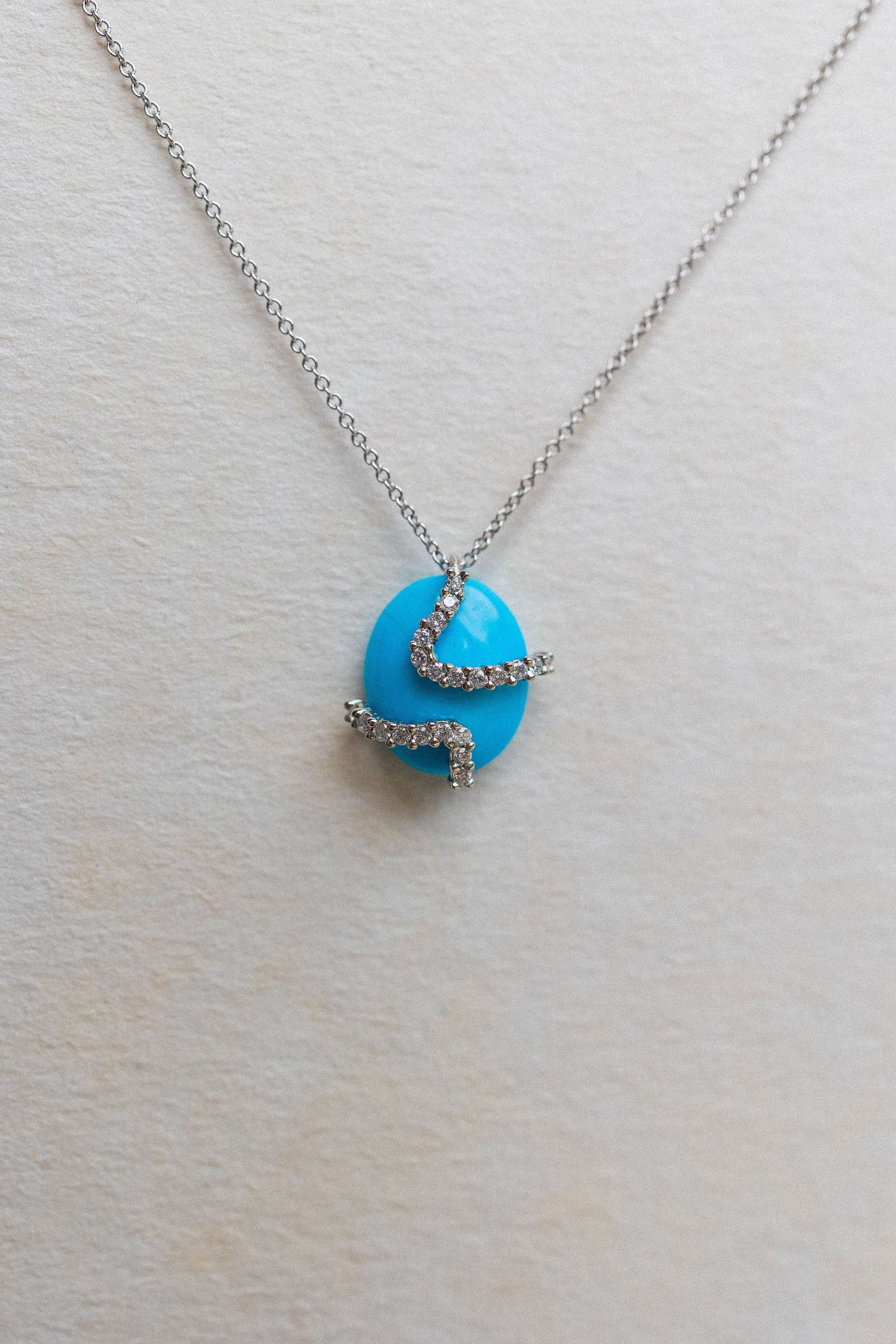 Está diseñado con una turquesa, diamantes y oro blanco de 14k, transformando la admiración por el océano en una joya única.