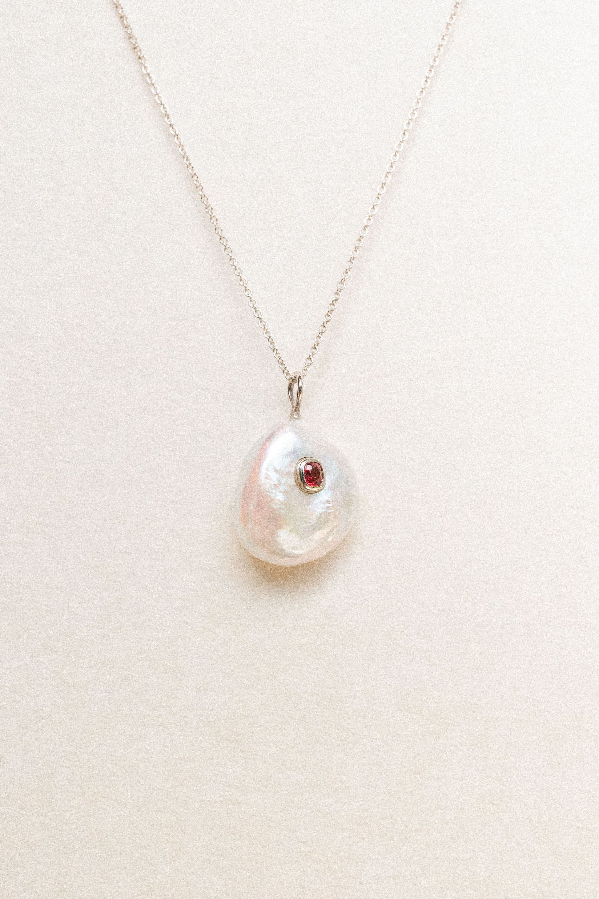 Una perla barroca es el corazón de esta pieza, acompañada por el contraste vibrante de una espinela. Un dije pensado para llevar contigo la esencia del océano: único, imperfecto y lleno de vida.