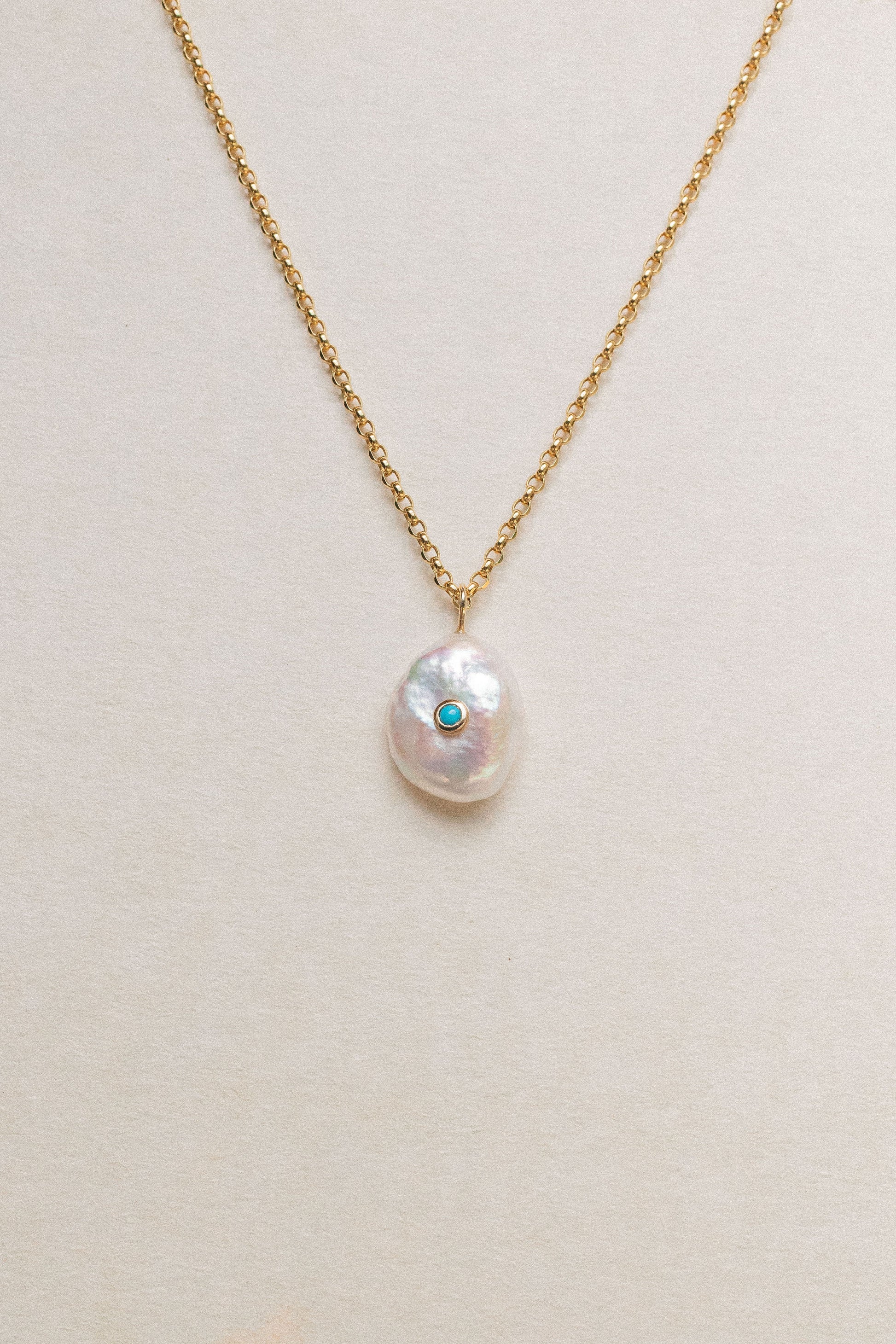 Una perla barroca es el corazón de esta pieza, acompañada por el contraste vibrante de una turquesa. Un dije pensado para llevar contigo la esencia del océano: único, imperfecto y lleno de vida.
